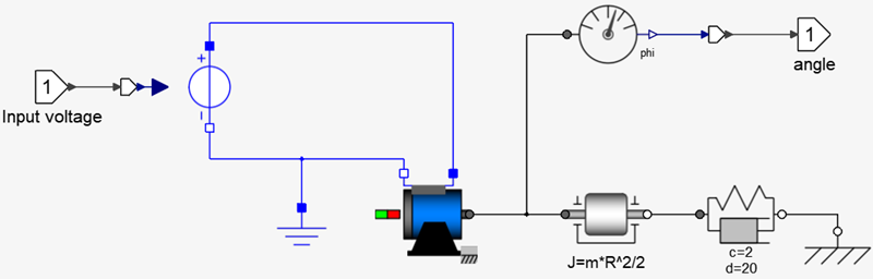 An example of an electromechanical system modeled using Modelica blocks and controlled by a discrete-time controller implemented with Twin Activate blocks, is considered here. The electromechanical part consists of a DC motor controlled by an input voltage, rotating a mass attached to a grounded spring damper system.