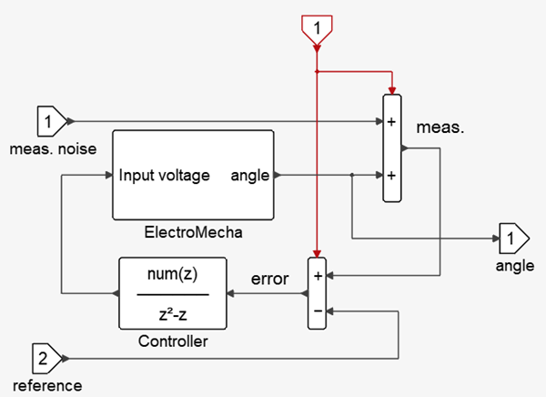 The denominator of the transfer function is fixed (chosen to obtain infinite gain at zero frequency to reject constant bias); the numerator (vector) is the control parameter, which should be exposed. The controller input is the difference between the measured angle and a reference angle. The measured angle is obtained by sampling the actual output and adding measurement noise.