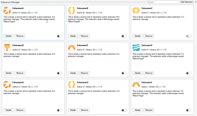 Use the Extension Manager to create custom extensions, load extensions automatically, and add custom documentation for defined features.
