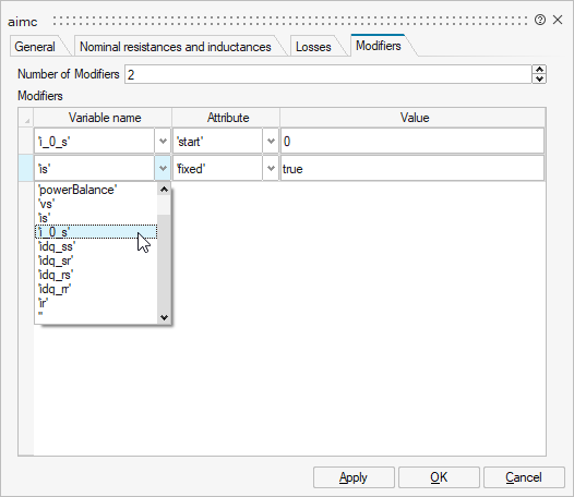 When you double-click a Modelica component, the parameters dialog box shows only relevant variables in the General tab under the Initialization section. You can set any other internal variables in the Modifiers tab.