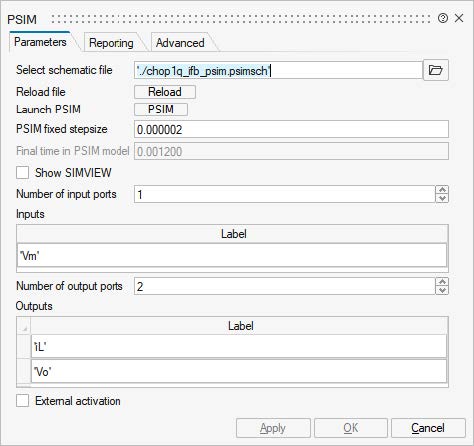 In Twin Activate, double click on the PSIM block to open the dialog, and click on the Advanced tab, as shown in Figure 12. Choose the number of variables that should be passed to PSIM and provide their name in PSIM and their values in the table.