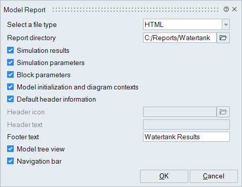 the report for the Watertank model looks something like this:The completed report includes a publishing date, the name of the model, an