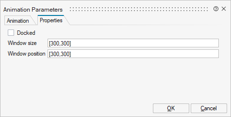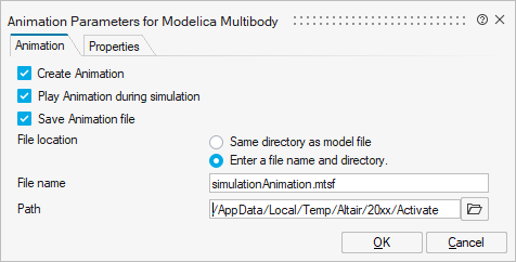 Parameter Description Create Animation Create an animation of your model simulation. A notice icon is displayed on the ribbon when this option is selected. For convenience, if you wish to disable the option, you can click the icon rather than deselecting the option from the animation dialog.Play Animation during simulation Play the animation in real time while your simulation is running. Save Animation file Save the animation as an .mtsf file. Enter a file name and path for the file. -
