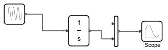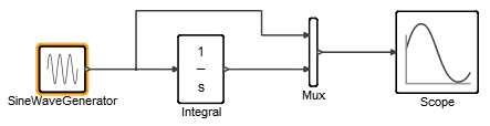 7. Link the remaining blocks in the diagram as you see in the following figure. Note the bend in the link between the first two blocks. If your link is straight, create the bend by selecting the SineWaveGenerator block and moving it upward so that it is higher than the Integral block.