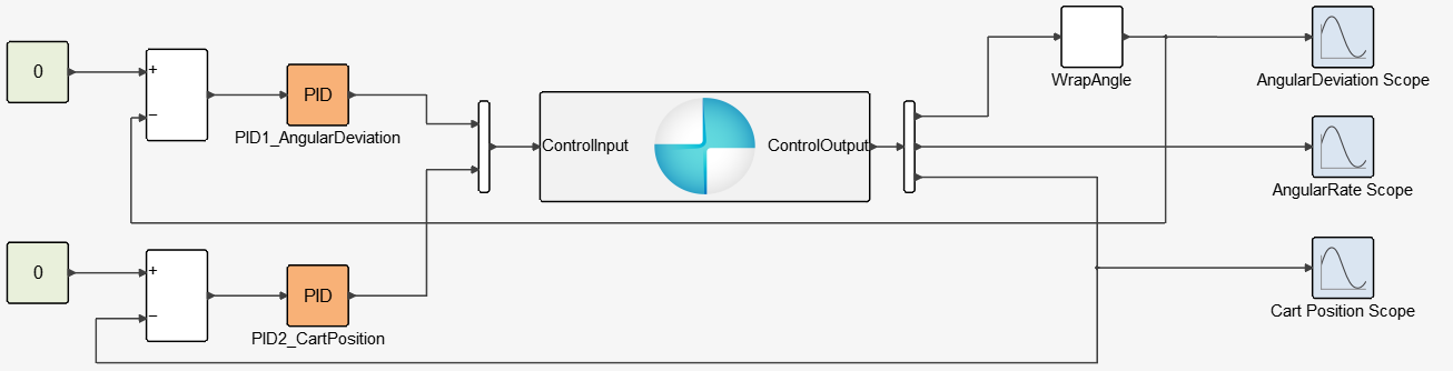 The Scope blocks in the model generate the following plots for the cart: Angular Deviation, Angular Rate and Cart Position. - Experiment with the diagram by modifying the PID gain parameters and evaluating their effect on the simulation.