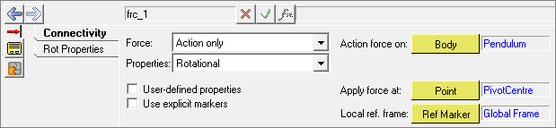 - For Connectivity parameters, set the parent body to Pendulum; set the origin to PendulumCenter; set the direction to the point PivotCenter.