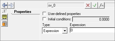 As you see in the following figure, on the Trans Properties tab for ControlForce, for Fx, select Expression, and for f, enter: `VARVAL({sv_0.id})`. This expression specifies the ControlForce to be the first solver variable, sv_0. This variable sets the control signal sent from Twin Activate to be the control force acting on the translational joint of the Cart.