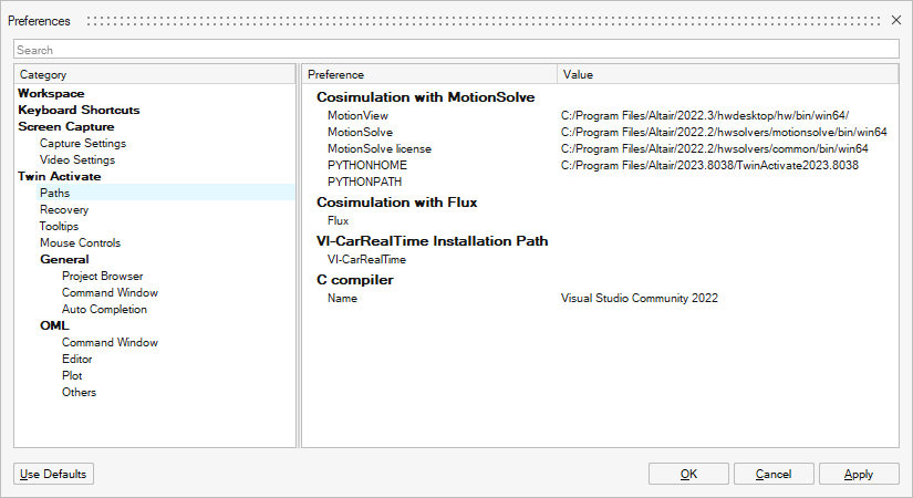 Preference Path MotionView <HyperWorks_install_path>/hwdesktop/hw/bin/platform MotionSolve <HyperWorks_install_path>/hwsolvers/motionsolve/bin/platform MotionSolve License (Radflex) <HyperWorks_install_path>/hwsolvers/common/bin/platform Python (For HyperWorks 2021): <HyperWorks_install_path>/common/python/python3.5/platform