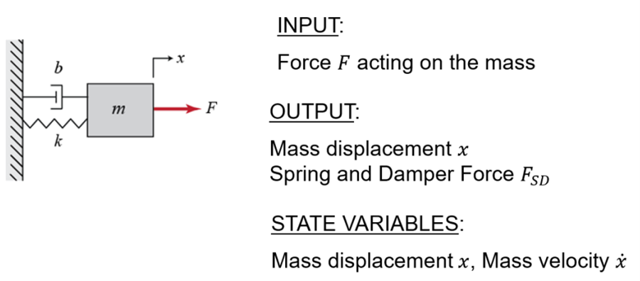 The model covered in this tutorial is a mass-spring-damper system, shown in the figure below.