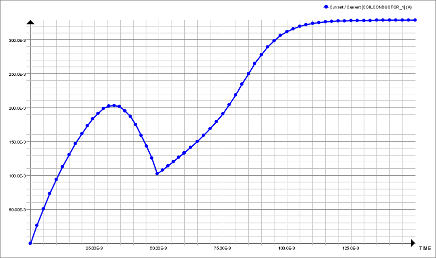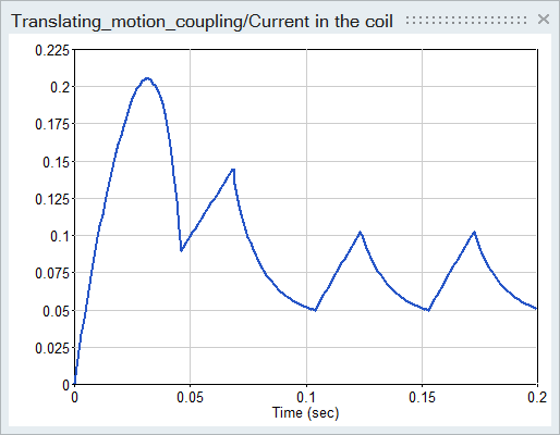 The scopes in the Twin Activate model plot the simulation results of the current fed into the coil of the plunger.Figure 4. Current/Coil Conductor_1 (A) Without Regulation Figure 5. Current Coil Conductor With Regulation