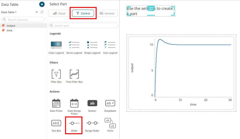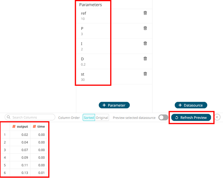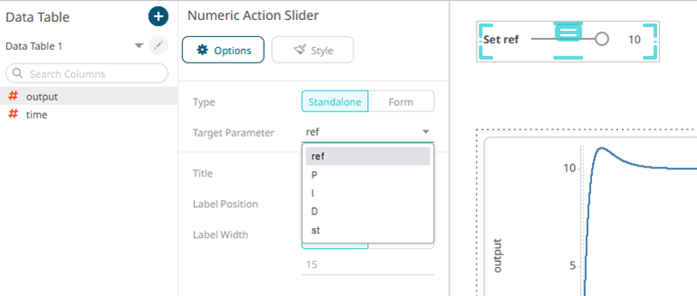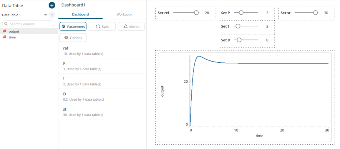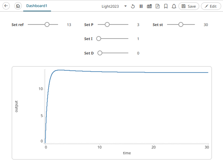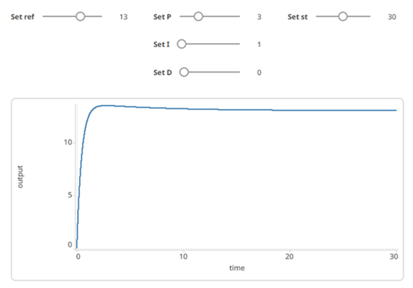 This entire model is exported as an FMU with input and output ports. In Panopticon, a dashboard is created to parametrize the FMU parameters P, I, and D and to run the dynamical model and get the outputs.