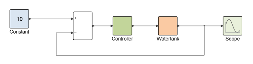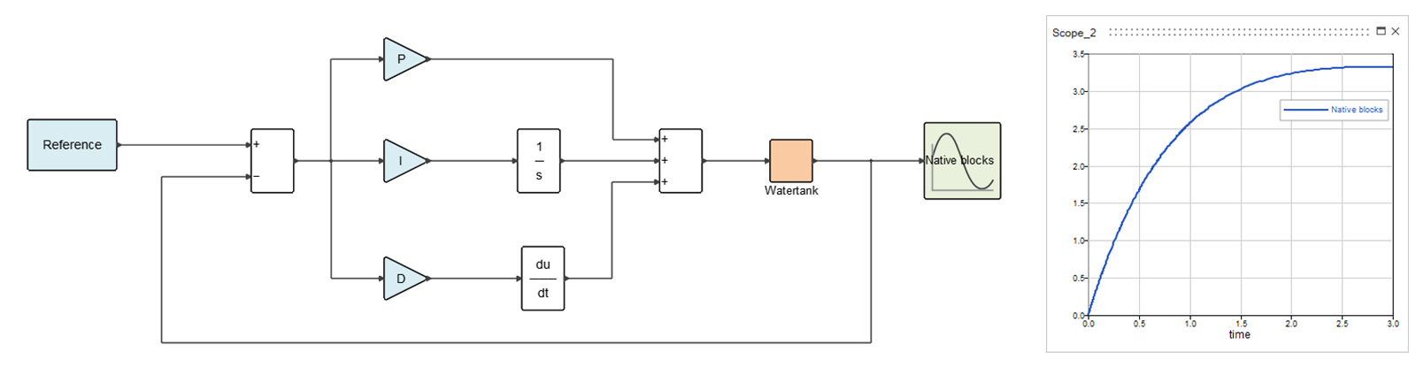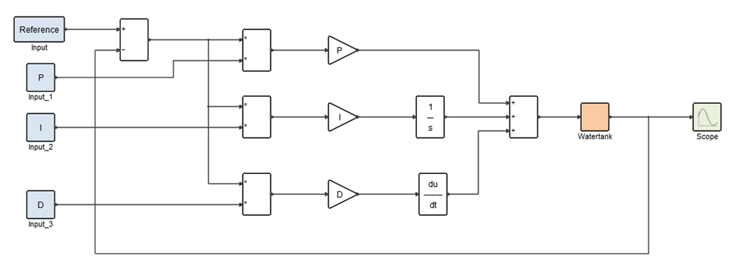 In this case, a dynamic model of a controlled water tank, where a reference level signal is set, uses a PID controller to make the plant reach the right water level: