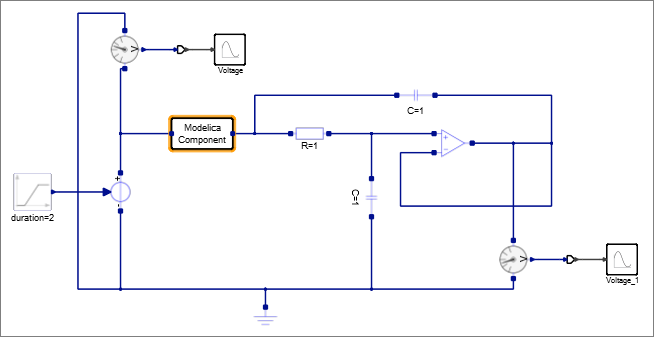 One of the two original resistor blocks is replaced with the Modelica Component. Your model should look something like this: