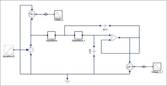 The SuperBlock replaces the second resistor block. The model now contains two super blocks: SuperBlock and SuperBlock_1.