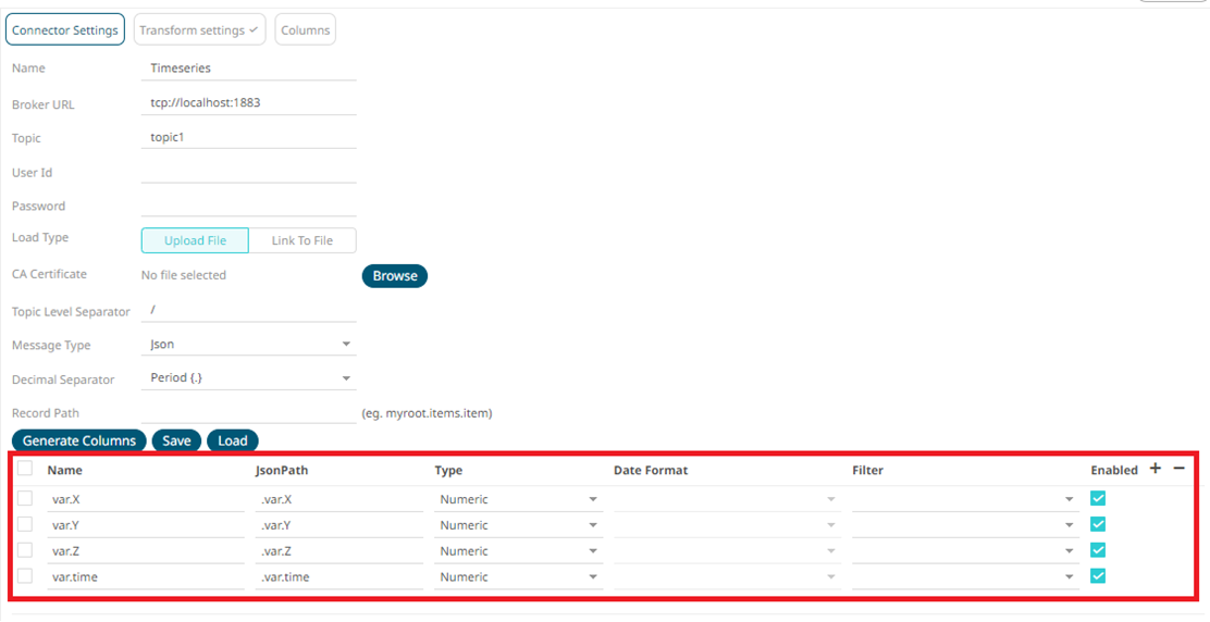 Note: If Twin Activate is not running and sending data, selecting Generate Columns will generate an error.