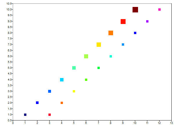 s1 = scatter(3:12,1:10,[], rainbow(10));