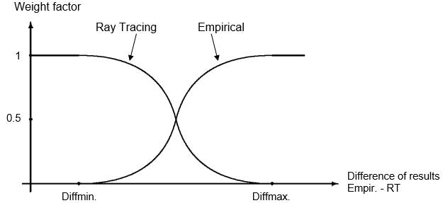 Depending on the difference between the ray-optical and the empirical prediction, a weighted sum of both predictions is computed. The functions for the weight factor are either or . Therefore the sum of both functions is always equal to 1 for all possible values of x.
