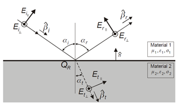 Specular reflection phenomena are the mechanism by which a ray is reflected at an angle equal to the incident angle. The reflected wave fields are related to the incident wave fields through a reflection coefficient which can be expressed as a matrix when the full polarimetric description of the wave field is taken into account. The most common expression for the reflection is the Fresnel reflection coefficient which is valid for an infinite boundary between two mediums, for example, between air and concrete. The Fresnel reflection coefficient depends on the incident wave field and upon the permittivity and conductivity of each medium. The application of the Fresnel reflection coefficient formulas is popular, and these equations are also applied in ProMan.