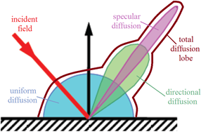 The first two components result from first-order surface reflections on the tangential planes: ρsr is due to reflection from the mean surface and ρdd is due to diffraction and interference from surface irregularities. The third component ρud results from multiple surface and subsurface reflections. In the limit of the surface roughness approaching zero, the first term will approach the familiar specular reflection of a flat surface while the other two terms approach zero.