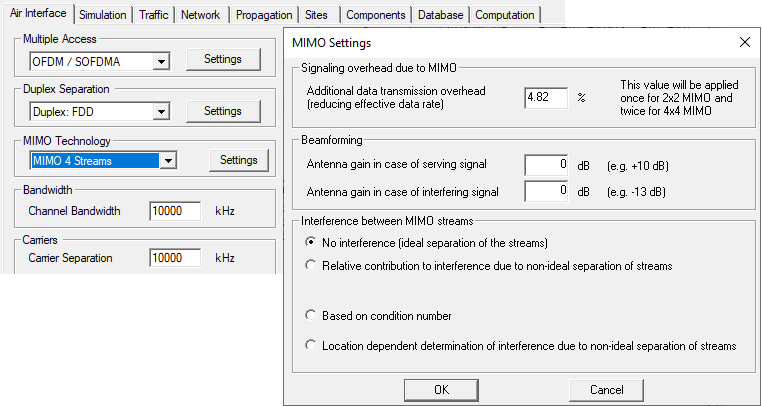 In this kind of simulation, every base-station antenna element is explicitly defined in the project. For every base-station antenna element, you have to specify which carrier it will use, which signal group it will transmit, and, in case of MIMO, which MIMO stream it will transmit. At the receiver side, it is assumed that the number of receiver antenna elements is at least as high as the number of MIMO streams. The simulation results will include network-planning quantities like data rate.