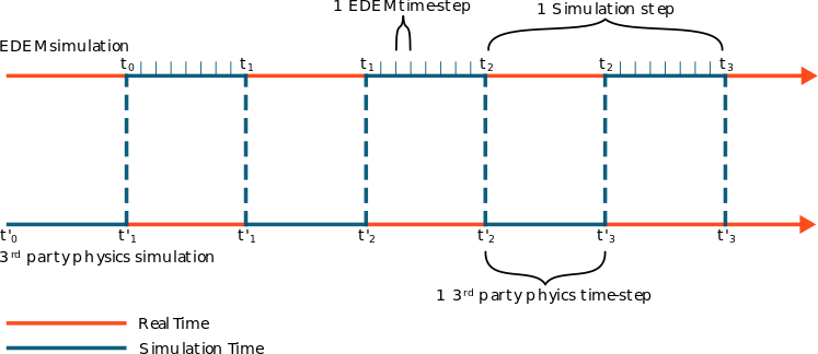 During a coupled EDEM simulation, EDEM and the coupled 3rd party code simulate in an alternating manner, with the 3rd party code first. The 3rd party code will simulate ahead in time and then pass any required data to EDEM for it to be allowed to simulate to the same point in time. This alternating pattern continues until the simulation time has reached the specified end time, shown in the following image. Due to the explicit time integration methods implemented in EDEM, it is common that multiple Time Steps are required to simulate the same time period as a single Time Step of either a CFD or Multi Body dynamics simulation. Therefore, Time Steps between the two solvers are potentially different, though the simulation-steps are the same.