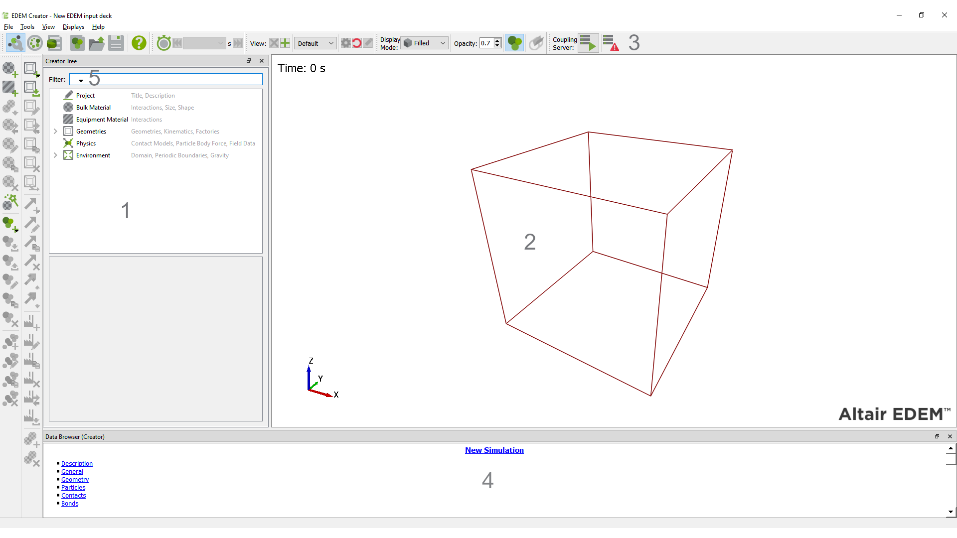 The Tree is displayed on the left side of the EDEM window and allows you to input Bulk Material, Equipment Material, and define the simulation environment. The tree comprises icons and a ‘right-click’ menu system. EDEM Creator and Analyst use a similar tree system.