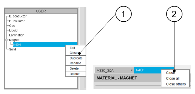 “Close a material” consists of removing the tabs of the material from the display area (output area). Several materials can be edited at the same time, therefore editing a new material does not automatically close the others.