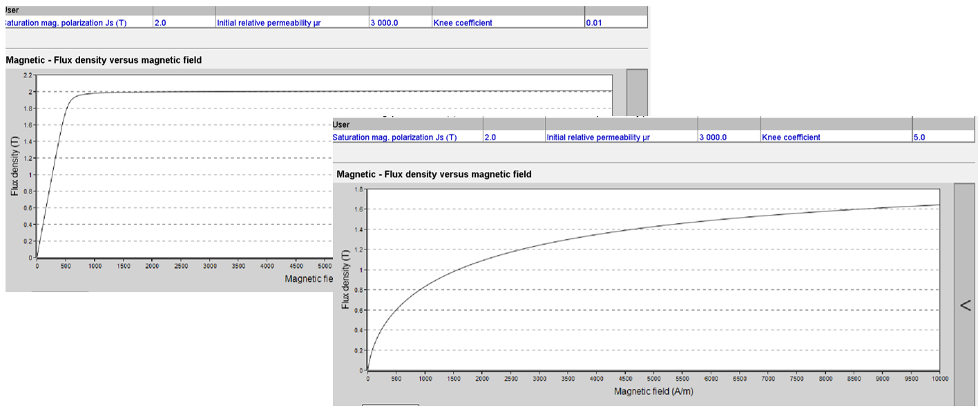 Shape of B(H) curve with the function of knee coefficient. Left knee coefficient = 0.01. Right knee coefficient = 5 |