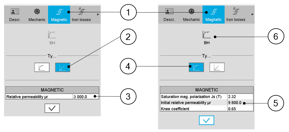 | 1 | When editing the properties of an existing material (lamination and solid families), a category is dedicated to the magnetic data. Hence, clicking on the “Magnetic” one can define the B(H) curve. |