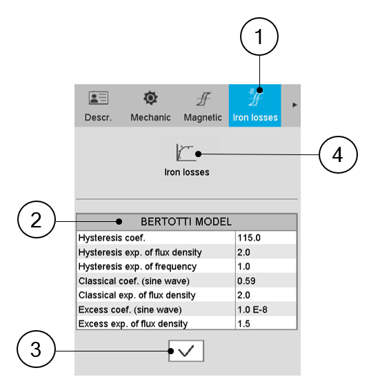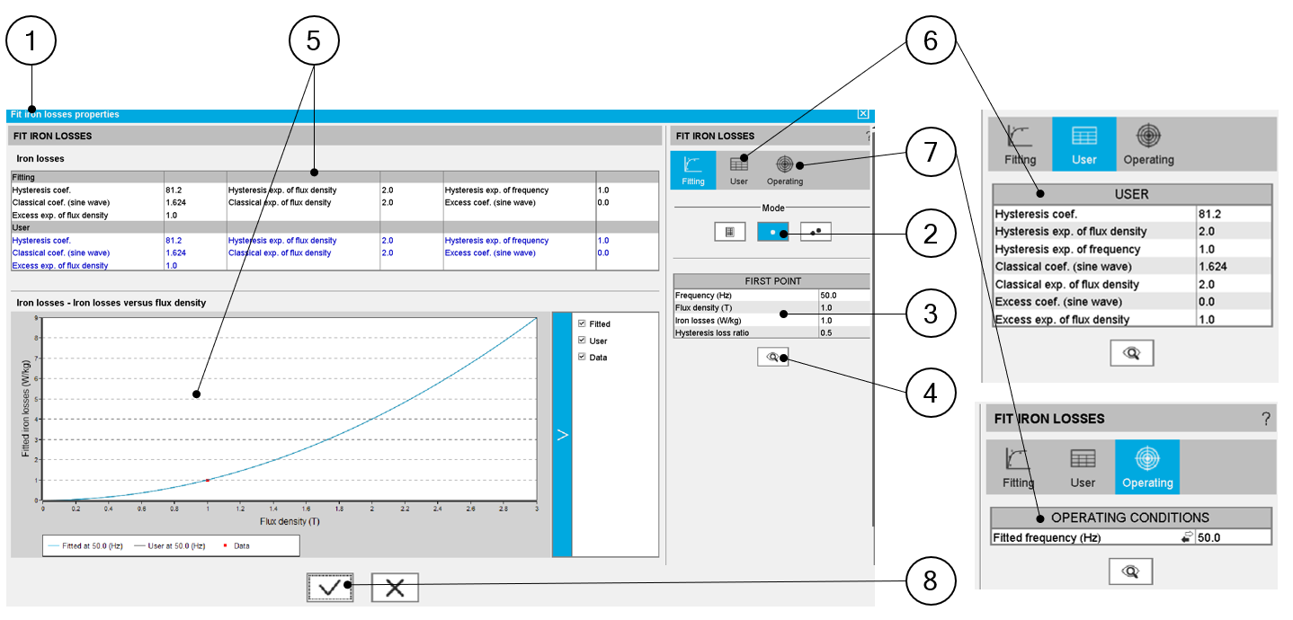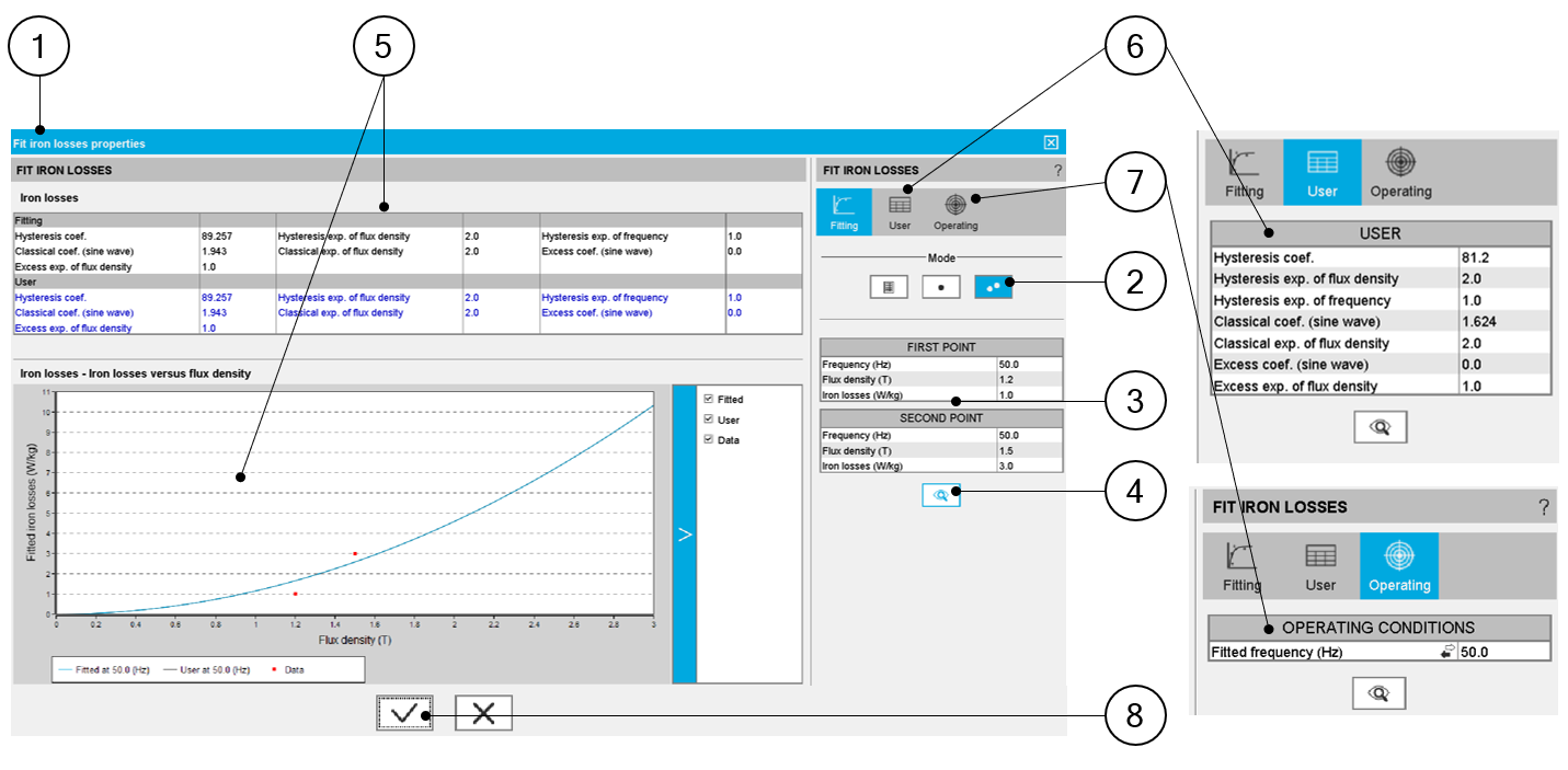 | 1 | Dialog box dedicated to fit the iron loss parameters. Located in the “iron losses” category when visualizing or editing the material properties. |