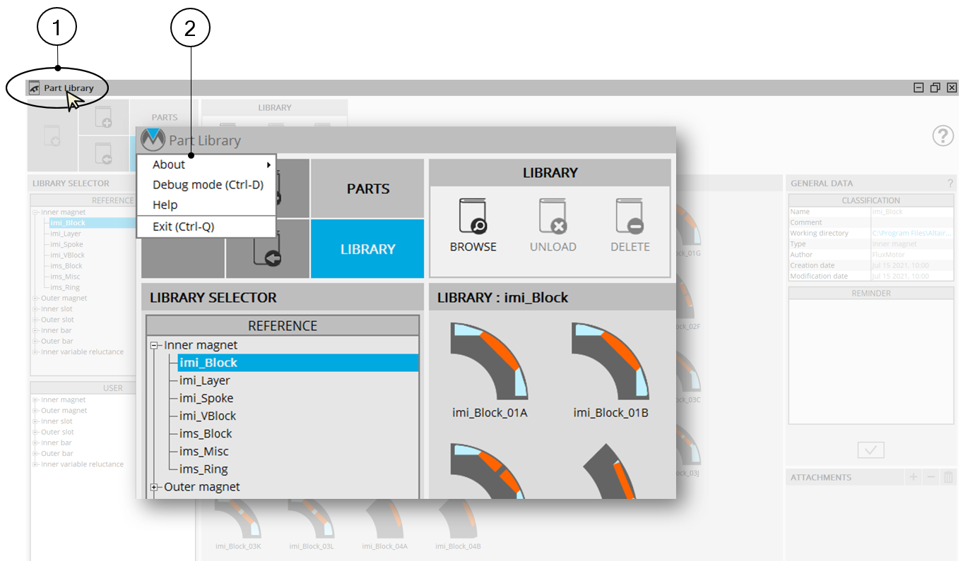 | 2 | List of actions available:ü Aboutü Debug modeü Help to open the online help documentation directly on the chapter dealing with Part Libraryü Exit for closing “Part Library” from the top menu of Part Library |
