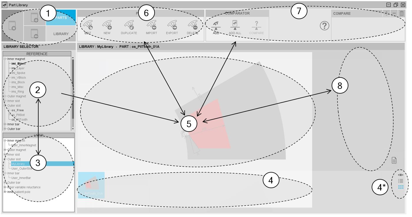 Here are the main zones that compose “PARTS” environment of the Part library.
