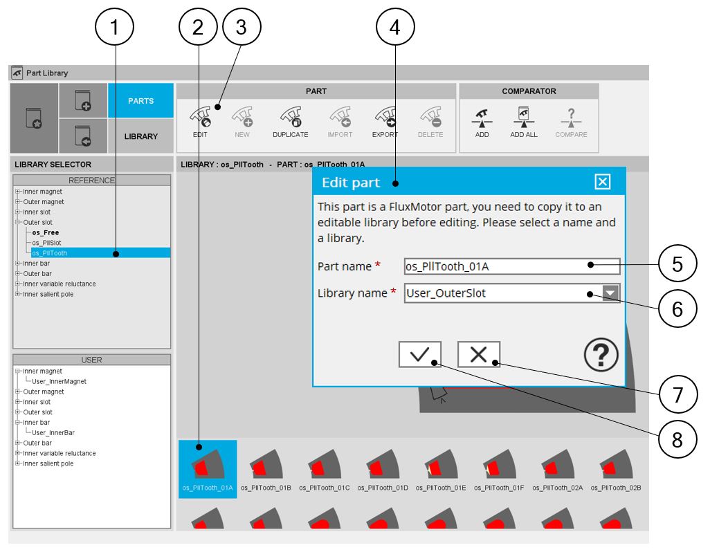 | 2 | Selection of one part in the selected library. This part is displayed in the central area. |