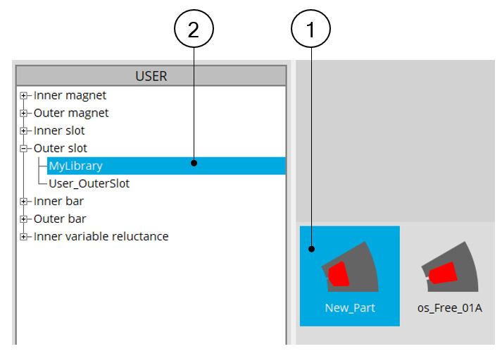 | The new part “New_Part” (1) previously created is stored in the corresponding library (2). |