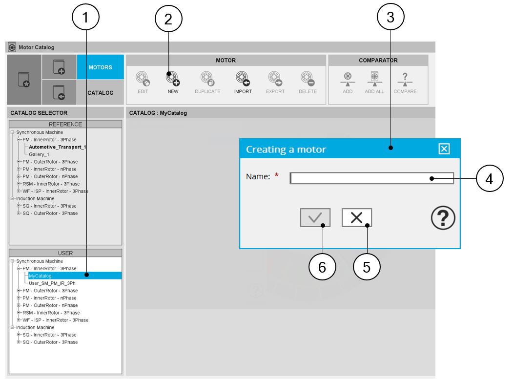 | 1 | Selection of a user’s catalog in which the new motor will be stored. The selected catalog must correspond to the type of the motor to be created. |