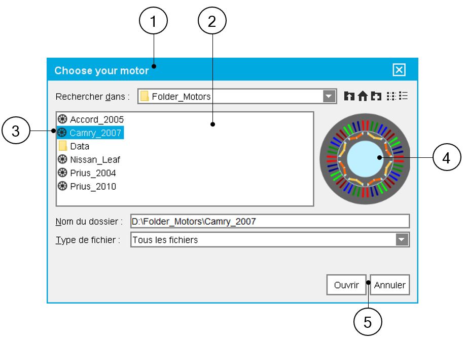 | 1 | Visualization of reference catalog i.e. the catalogs of motor topologies provided with FluxMotor®. Select them to view their contents and choose motors among them. |