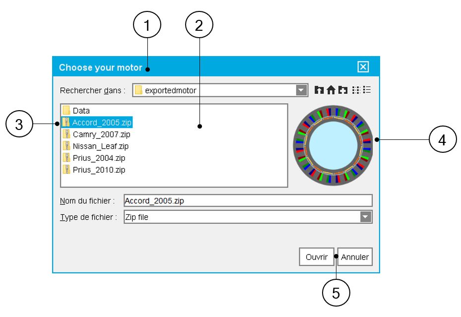 | 1 | Selected user’s catalog in which the motor must be imported: in that case outer rotor synchronous machine with permanent magnets |