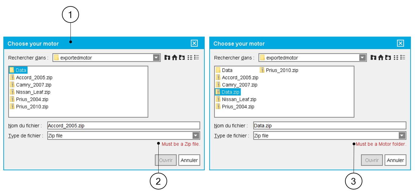 Select the motor to be imported. When the selected folder corresponds to a motor, an icon representing a motor is displayed before the motor name. When the selected folder is not identified as a motor, a warning message is written in red (Must be a motor folder). Please see the following illustration |