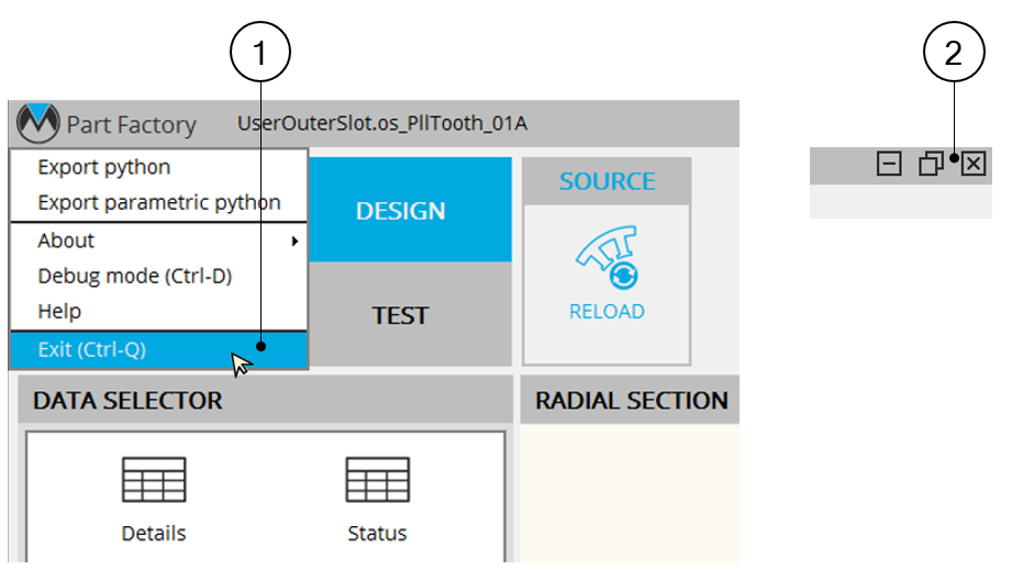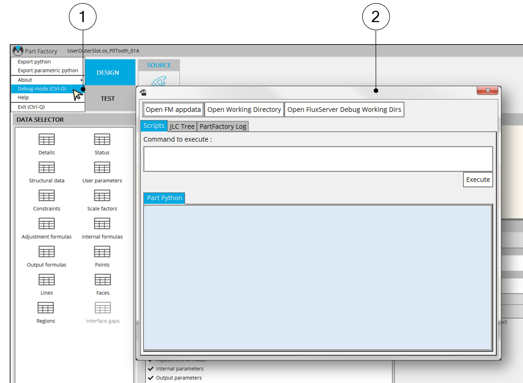 | 1 | Access to the “Debug mode” from the top menu of Part Factory. |