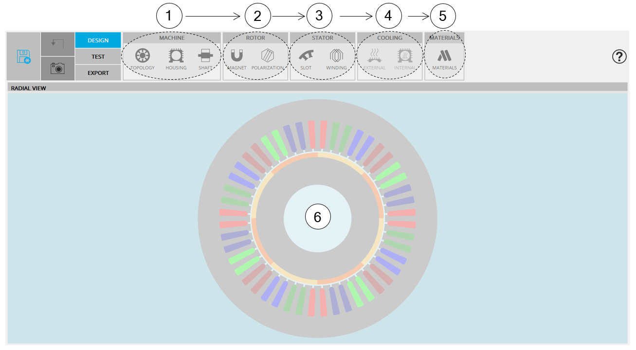 | Zone 6 VIEW | Visualization of the motor radial view. The winding (automatically defined) is shown. Note: Graphic functions like export picture and zoom are available on this view by right clicking on mouse (right part of the panel). See system functions, graphic management to get more information. |