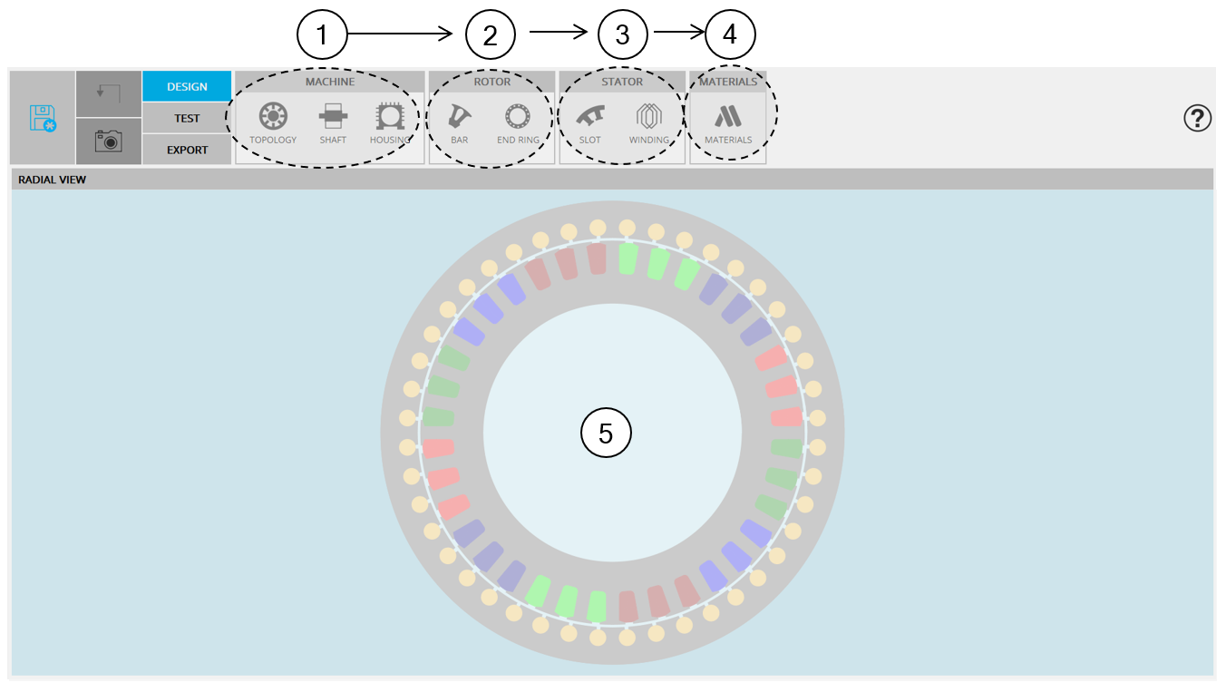 | Zone 4 MATERIALS | Area to select all the materials needed to build the machine, rotor and stator. |