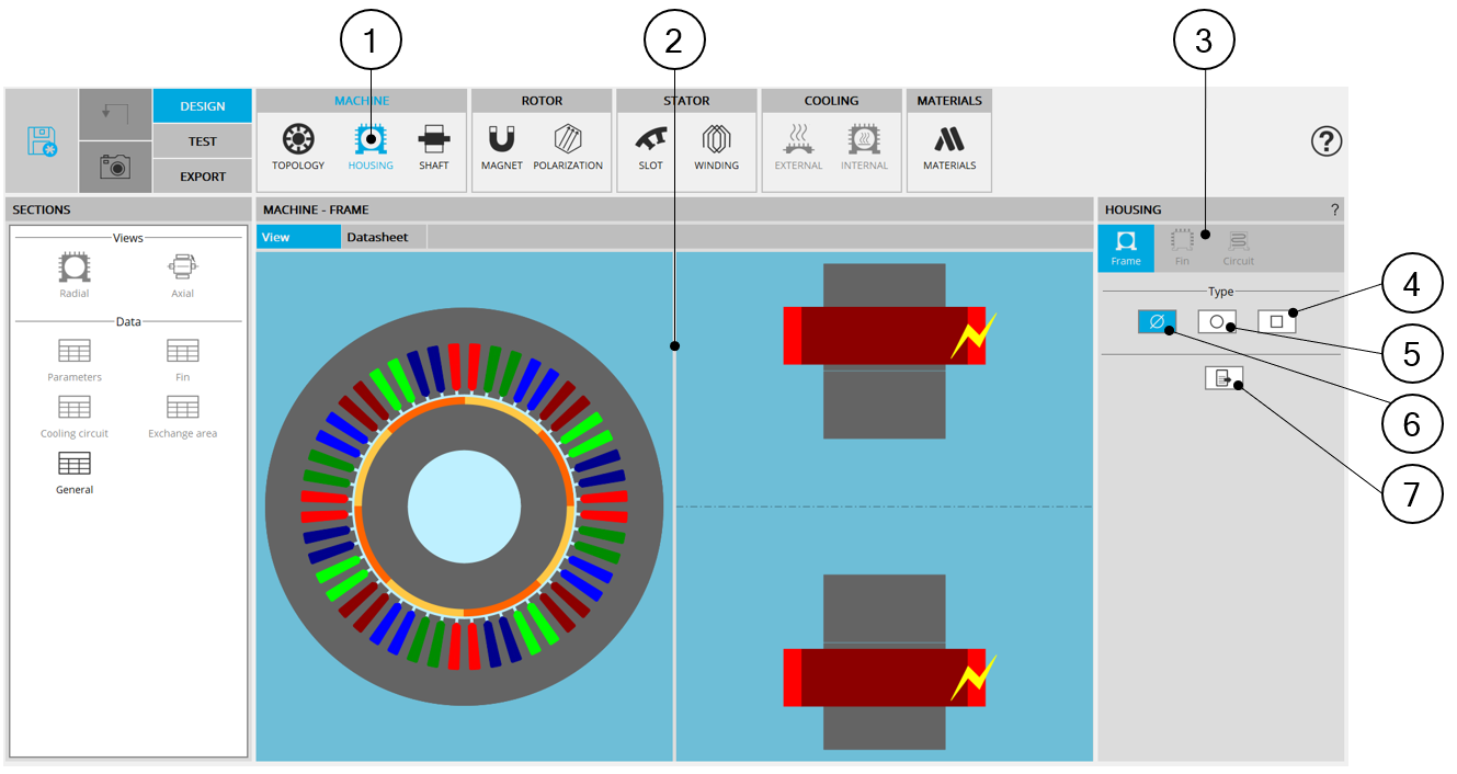 with the Housing: Frame, Fin and Cooling circuit. Note: By default, the section Frame is selected. |