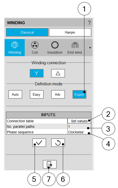 | 6 | Icon to restore default input values. Default values are those which define the winding architecture by using the automatic mode. |