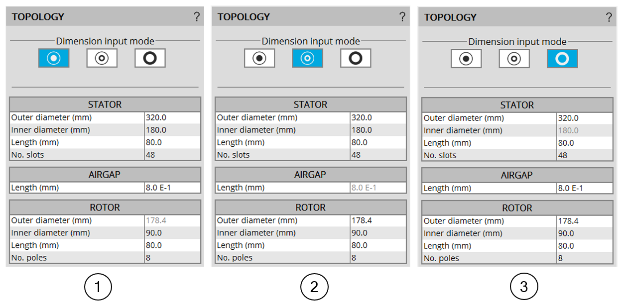 In the topology sub area, three ways are possible to define the structural data of the machine, with the diameters and the airgap. They are illustrated below.