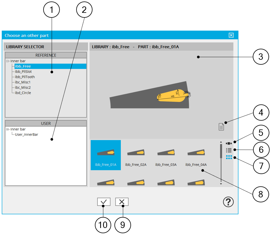 8 Area to visualize all the topologies of bars from the selected library (ref. 1).