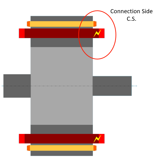 | Dimensions are illustrated with arrows | Connection side (C.S.) is identified by yellow lightning. |