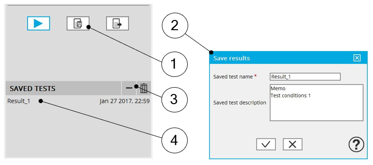 Once a test is completed, the corresponding results can be saved by using the Save test results button (1).