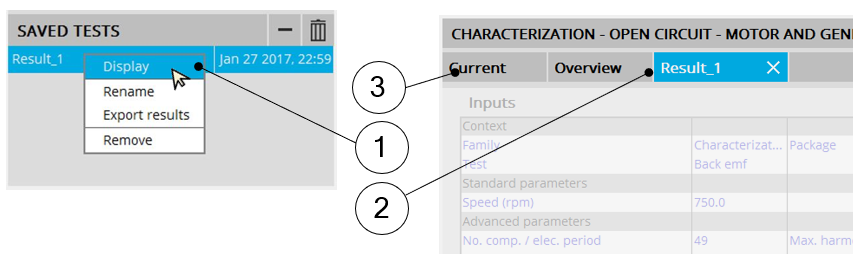 the command “ Display ”. A double-click on the saved test result name ( for example Result_1 ) gives the same result. |