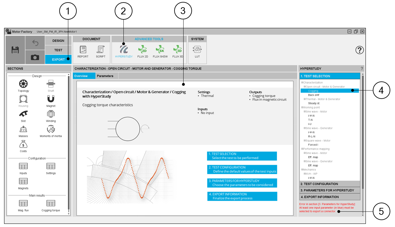 The aim of this export is to build a connector, allowing Altair® HyperStudy® to drive Altair® FluxMotor® for performing motor optimizations based on the computation processes embedded into FluxMotor®.