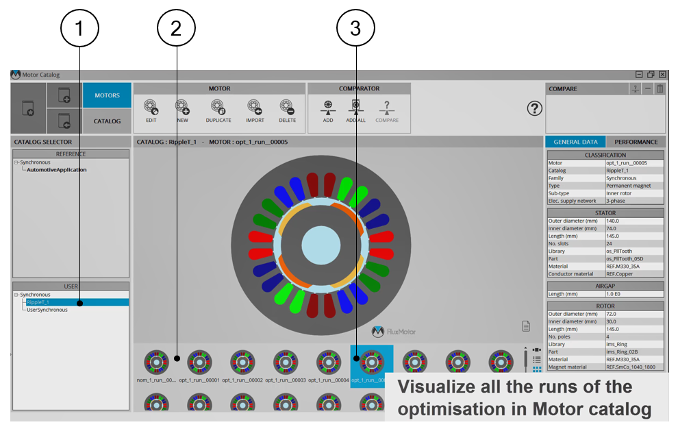 | 3 | Each motor can be selected, visualized and edited in the Motor Factory, to be evaluated more in depth |